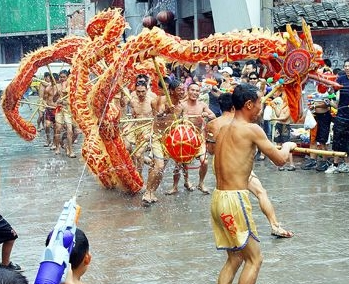 如今已發(fā)展成為對喜慶節(jié)日的慶祝,對美好生活祝福的一種方式。它用鮮棕葉作龍須,用葛藤、黃荊條、松樹枝作龍身,分9節(jié)、11節(jié)、1 3節(jié)、15節(jié)等不同長度的奇數(shù),由9至15人參加舞龍。伴著鑼、鼓、鎖吶的鏗鏘樂曲,一人持“寶”在前,龍舞歡騰時有“二龍搶寶”、“蛇蛻皮”、“烏龍絞柱”等50多種動作玩法。與此同時,身著民族服裝的群眾用臉盆、水瓢、銻桶等容器端水圍繞著龍潑澆,這樣邊舞邊潑水、水潑得越多龍舞得越歡,也預(yù)祝大家當(dāng)年風(fēng)調(diào)雨順,五谷豐登,其場面歡樂喜慶,風(fēng)趣幽默。已列入我市第一批非物質(zhì)文化遺產(chǎn)保護(hù)名錄。