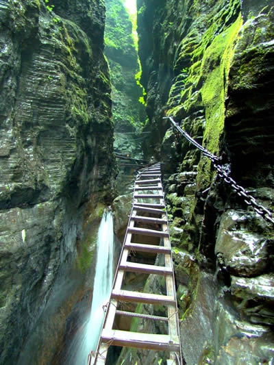 坐龍峽風(fēng)景區(qū) 坐龍峽擁有中國(guó)第一條特種游道。所有游道均建于峽谷深處,依山取勢(shì),既經(jīng)細(xì)心雕琢聽卻又渾然天成。粗樸的板栗木棧道,可以讓你零距離的親近那一潭碧幽、聽聞山泉叮咚;精巧的跳墩,可以讓你媳戲流泉、觸感溪瀑;原質(zhì)的石坎道,讓你不得不調(diào)動(dòng)全部的身心能量悉心攀援、感悟峽谷;有驚無(wú)險(xiǎn)的鐵梯,讓你伴著腳下轟鳴的溪水,在驚怵中體味一份快慰。出口處的土家山寨,保留了古樸獨(dú)特的生活習(xí)俗。一塊臘肉就一口醇香的“苞谷燒”會(huì)讓你洗去所有的疲憊,在輕松中憨厚的主人向你講述過去強(qiáng)人出沒的故事......