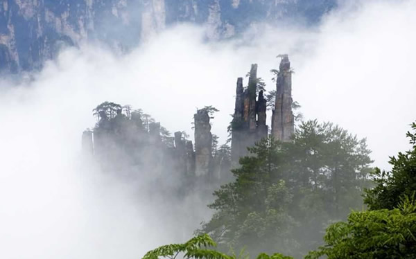 御筆峰是并列的三座石峰,高低不一,峰頂長有松樹,極象幾枝倒插的毛筆。傳說這是向王天子的“御用筆”,故名御筆峰。這里云纏霧繞,似沉似浮,人稱“瓊山仙閣”。 |