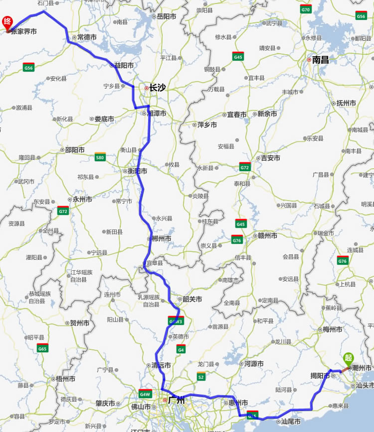 左右,沿途經過潮州——揭陽——惠州——廣州市——清遠——英德市——韶關市——樂昌市——宜章縣——郴州市——耒陽市——衡陽市——湘潭市——寧鄉(xiāng)縣——益陽市——常德市——慈利縣——張家界。