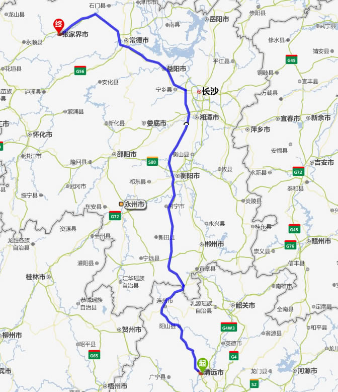 清遠(yuǎn)去張家界自駕車自助游線路圖全程高速):